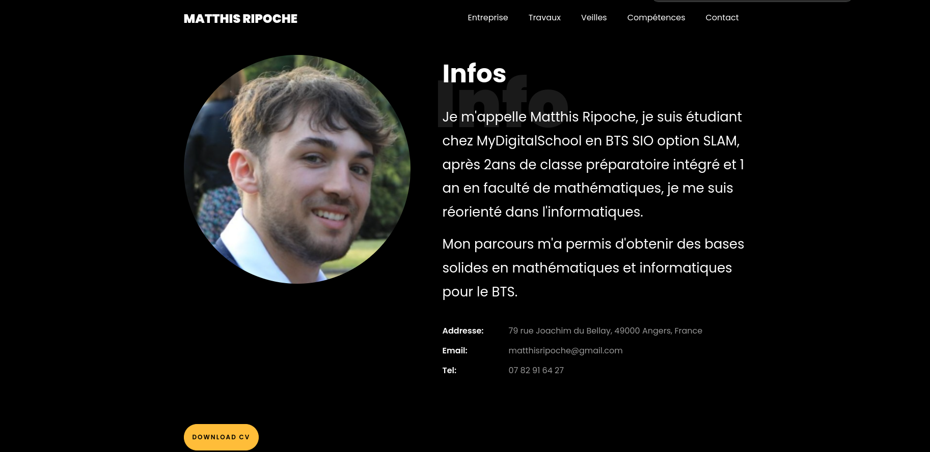 Le portfolio a été construit à partir d’un template librement disponible, puis adapté pour répondre à des besoins spécifiques, offrant ainsi une présentation claire et fonctionnelle de mon parcours et de mes compétences techniques.