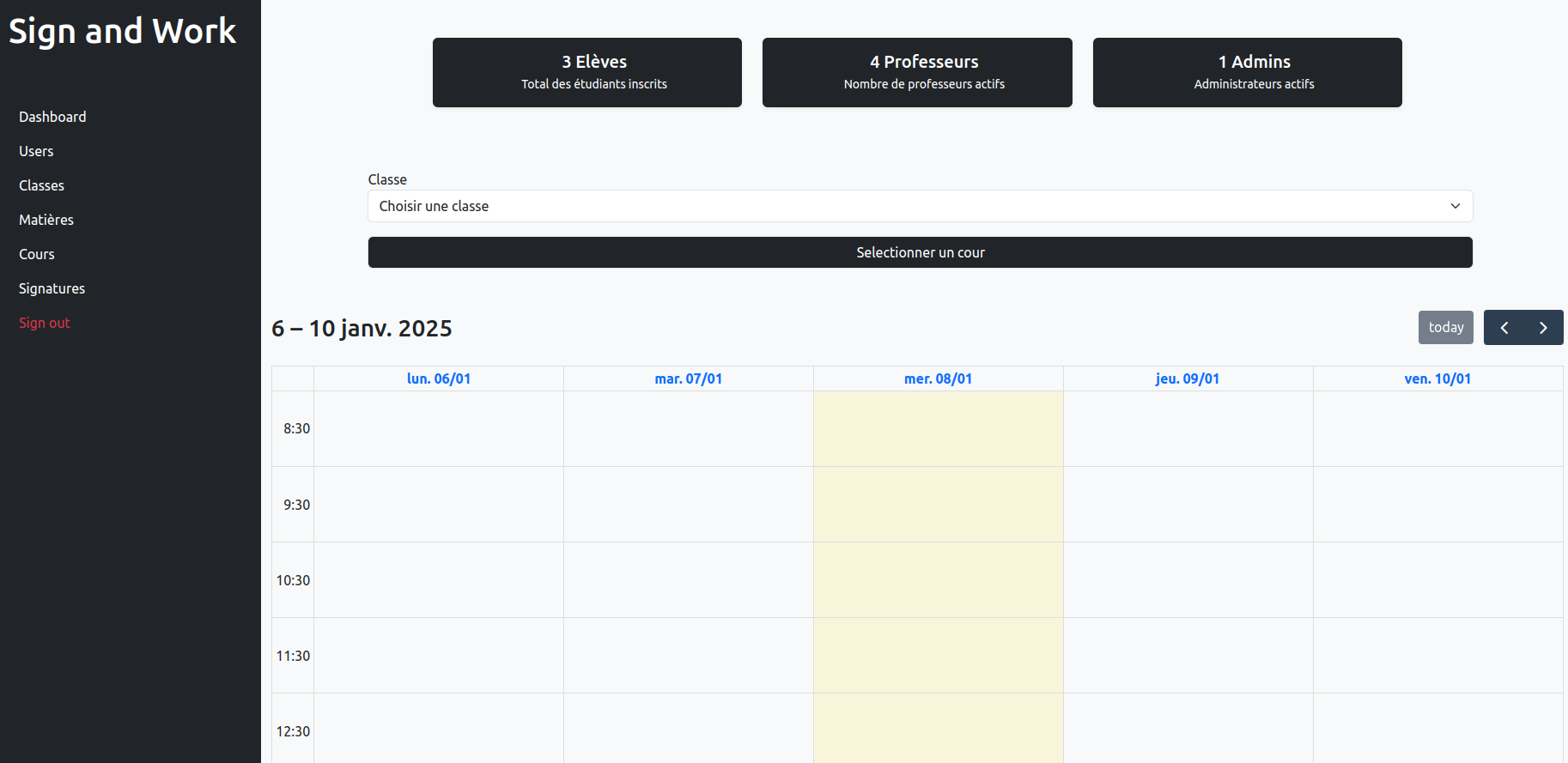 Sign and Work est une réalisation de classe conçu pour digitaliser la gestion des présences des étudiants, permettant à chaque étudiant de signer sa présence par matière et classe, avec une interface claire et un tableau de bord de gestion pour l'administration.
